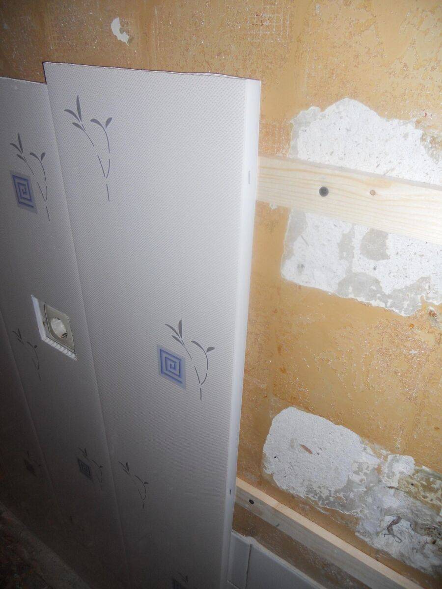 Обрешетка крепится к стене дюбелями, а панели к ней могут монтироваться саморезами, пресс-шайбами, через кляймеры финишными гвоздями или саморезами. Отделка с помощью обрешетки считается самым популярным и удобным способом.