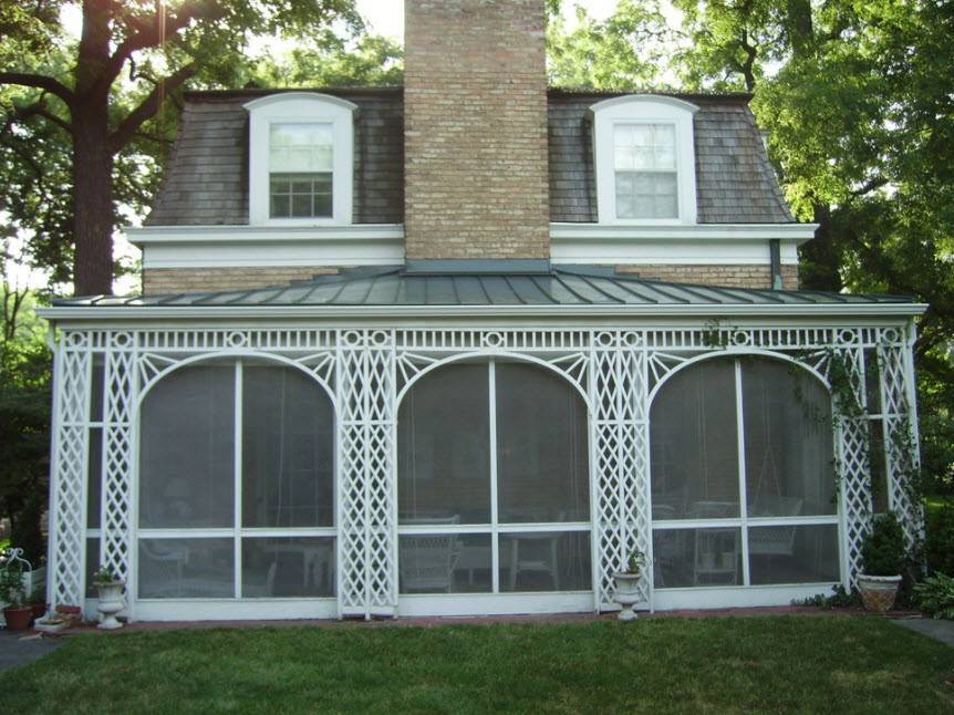 - Не всегда предоставляется возможность расположить веранду именно таким образом. Иногда перед фасадом здания слишком мало места. В таком случае можно пристроить веранду с торца. Выбирайте ту стену, которая не имеет оконного проема. Если перед входом в дом есть крыльцо, можно воспользоваться им как соединительным элементом между домом и верандой. Как правило, над крыльцом есть небольшой козырек. Если выдвинуть веранду немного вперед относительно лицевой стены дома на ширину козырька, а затем продлить крыльцо вдоль фасада до примыкания с верандой, получиться небольшой мостик. Соорудив над ним такой же козырек, вы сможете попадать на веранду прямиком из дома;
