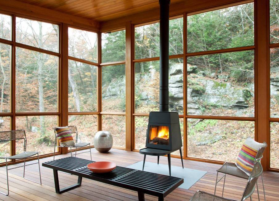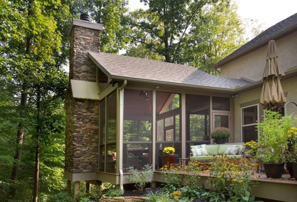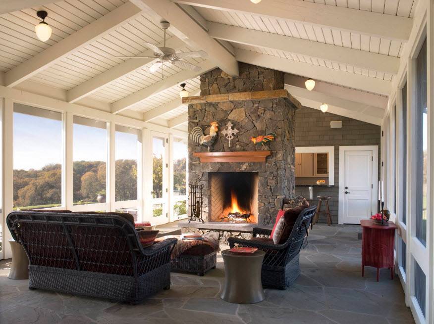 В закрытых пристройках ограничений в выборе отделки нет. Пол настилается террасной доской, выкладывается кусками камней, плиткой.
