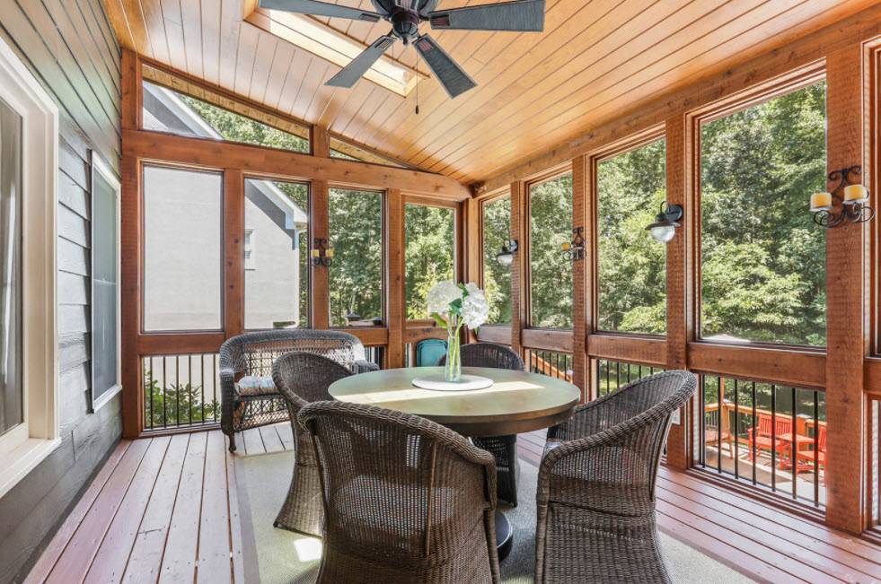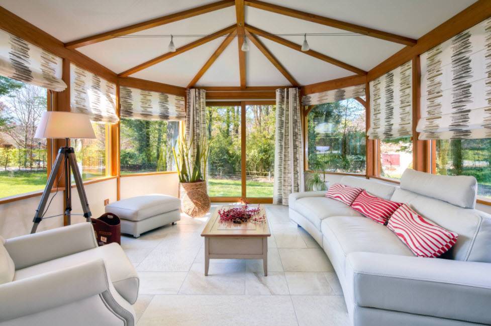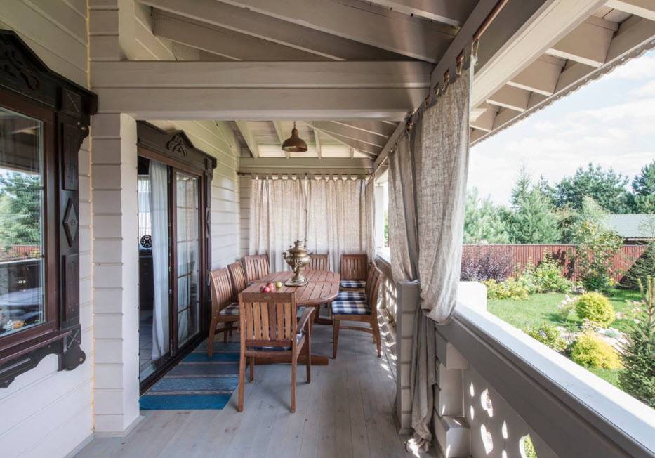 Предметы мебели выбираются, отталкиваясь от личных предпочтений. Это могут бить и простые деревянные лавки с мягкими подушками, и плетеные стулья. Главное, чтобы было достаточно посадочных мест. Для экономии места и возможности собрать мебель и отправить на зимнее хранение советуем выбирать складные конструкции. Чтобы сделать прием пищи или вечерние посиделки более интимными, можно организовать легкие занавески по периметру веранды. Можно комбинировать с рулонными шторами или плотными занавесками. Таким образом, вы сможете закрыться от посторонних глаз с нужной стороны.