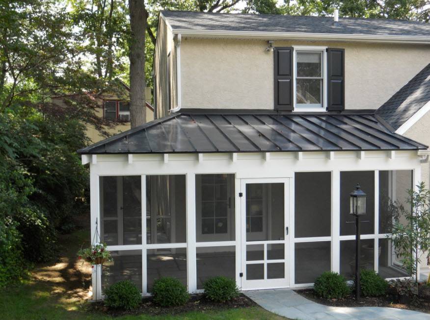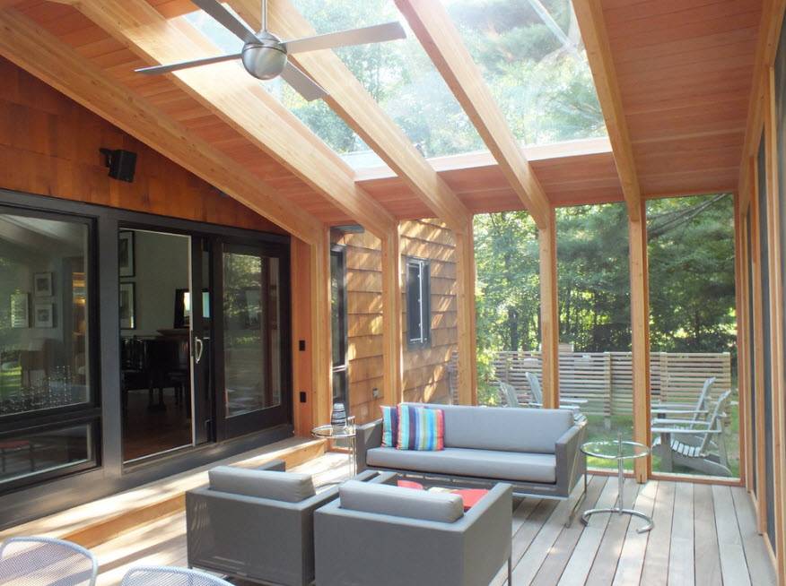 Традиционно крыша веранды должна иметь односкатную конструкцию, при этом угол наклона ската меньше, чем у крыши основной постройки. При этом нужно помнить, что веранда и дачный дом должны гармонировать, дополнять друг друга. Для этого лучше всего использовать одинаковый кровельный материал, как по виду, так и по цветовой гамме.