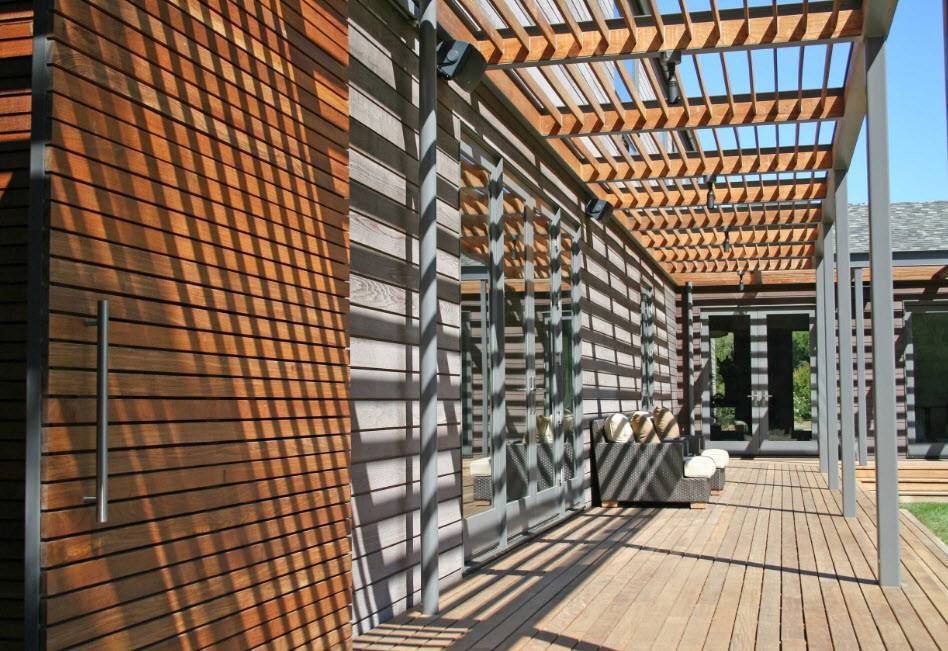 Даже терраса под крышей может оказаться под дождем при сильном боковом ветре. Для того, чтобы с настила вода могла стечь естественным путем, должен быть устроен небольшой уклон — 1 см на 1 метр. Его делают по направлению бороздок рифления, или от стены дома (для гладких видов декинга). А так как монтаж проводят по лагам, понижение уровня закладывают на стадии обустройства основания.