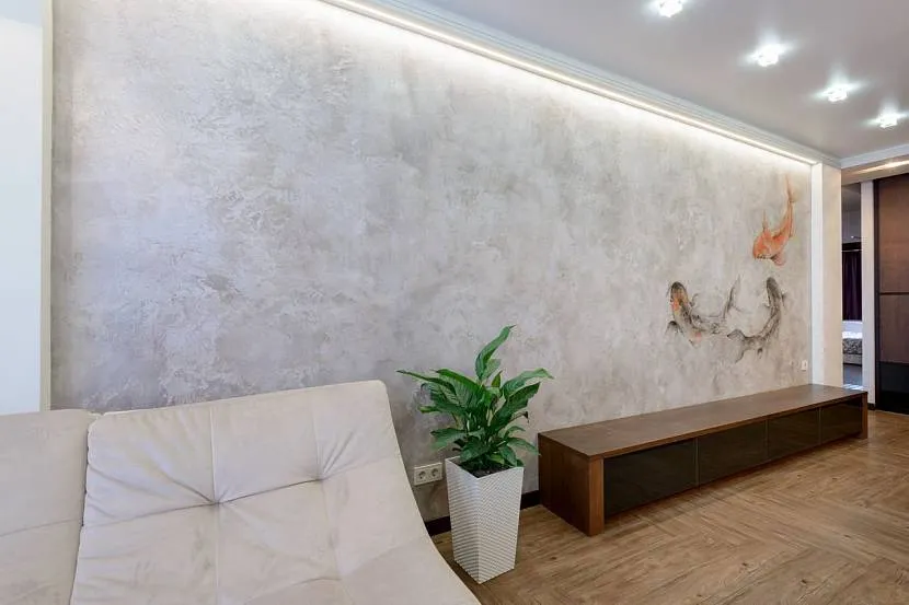 Мраморная декоративная штукатурка служит идеальным фоном для художественной отделки в виде рыбок Источник delaisteny.ru