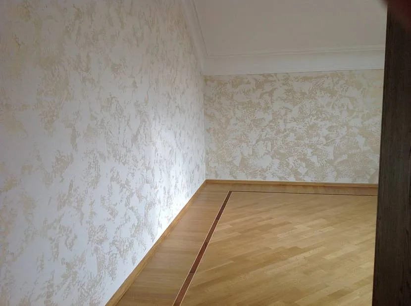 Отделка стены декоративной штукатуркой морской бриз гармонично сочетается с паркетом Источник oboitop.com.ua