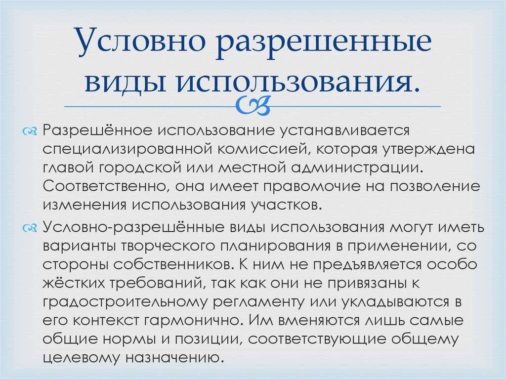Условно разрешенная разновидность имеет своей функцией дополнение категорий и разрешенного пользования. Внесение дополнений требуется при невозможности составить классификатор, включающий все случаи из жизни.