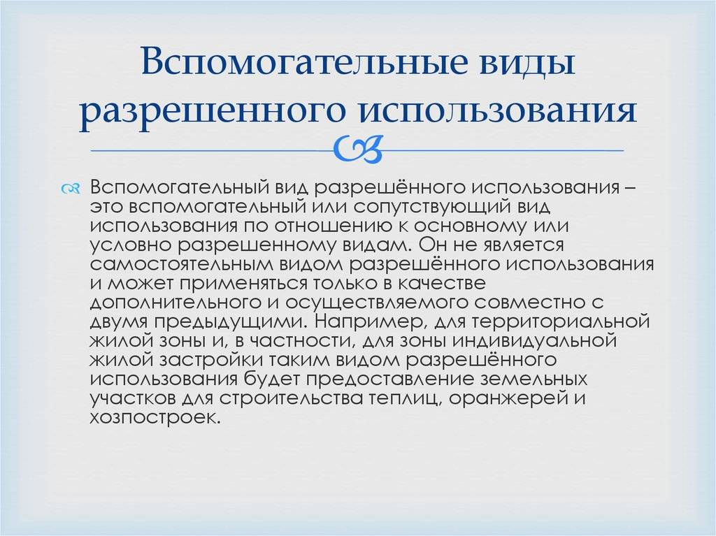 Вспомогательные виды направлены на дополнение функционала и обслуживания основных и условно разрешенных ВРИ.