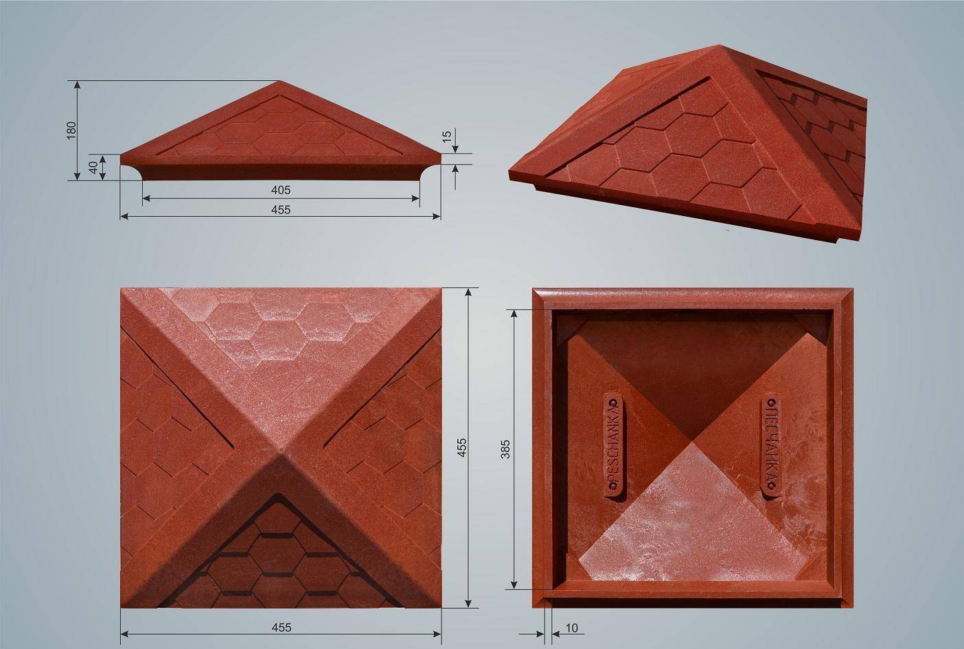 | Колпак из полимерно-песчаного композита «Гибкая черепица» | На столб 2×2 кирпича | 535×535×43 | 1490 |