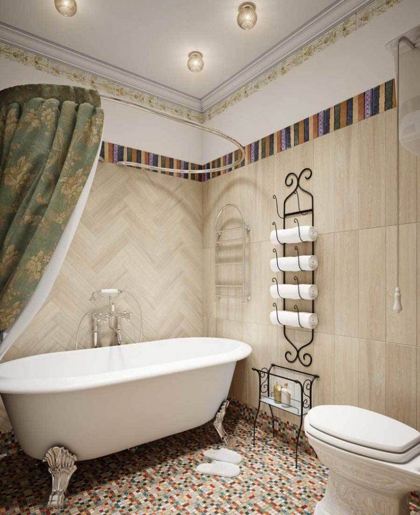 Дизайн в классическом стиле в некотором роде универсален. Стены оформляются в верхней части в светлые оттенки, внизу — темнее на 2-3 тона. Граница разделяется бордюром с орнаментом в виде геометрических фигур. Пол темный. Возможен вариант со светлой напольной плиткой, если требуется визуально увеличить помещение.