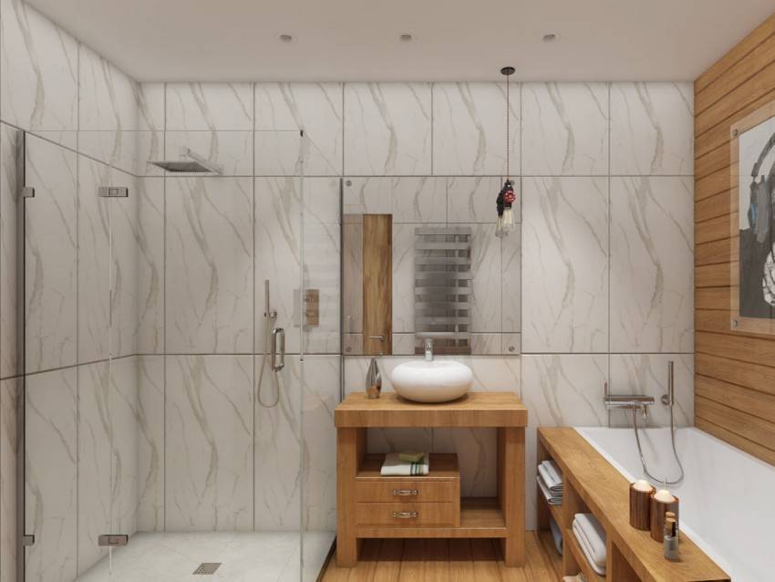 Размер должен соответствовать размеру вашей ванной комнаты. Большая плитка для ванной всегда смотрится круто на большом стенде, но представляйте её именно в контексте размеров вашего санузла. Если на всю длину стены ляжет меньше 3 штук, то стоит присмотреться к вариантам меньше. Стандарт 2+ плитки на одну стену. Учитывая размер наших типовых квартир, разгуляться получится только в совмещенной с туалетом ванной.
