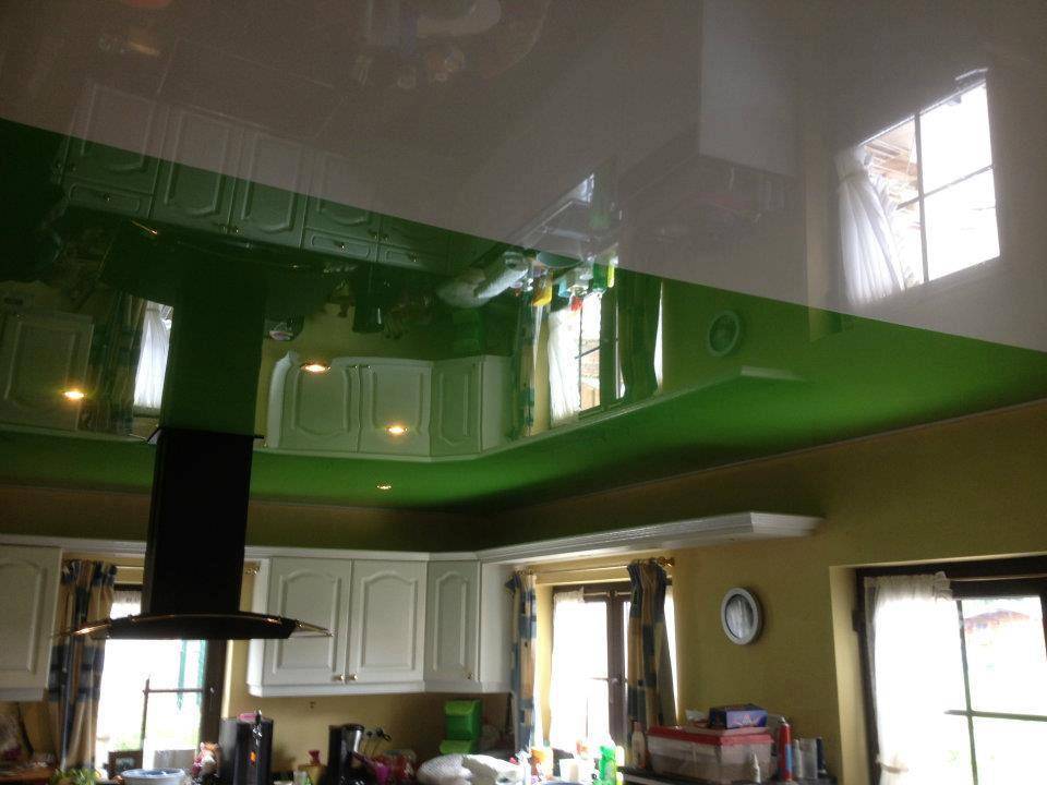 На кухне со светлым натяжным потолком уместно повесить контрастную лампу из бронзы, меди или другого темного металла. Черное или шоколадное полотно будет выгодно гармонировать с белым или стальным осветительным прибором.