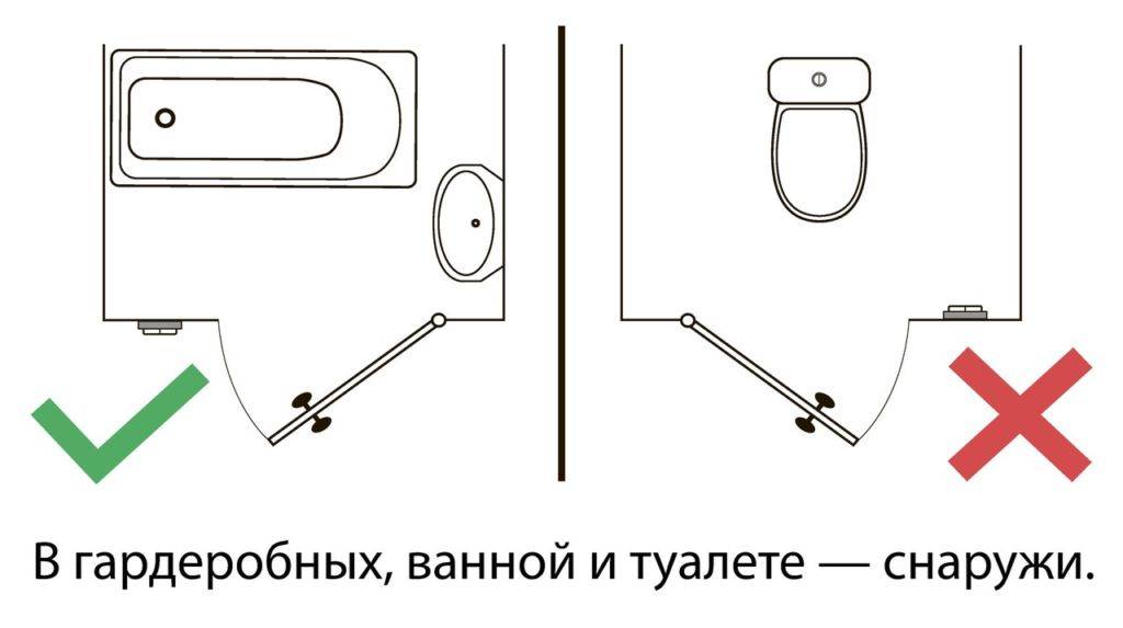 Выключатели располагают при входе в помещение с внешней или внутренней стороны. Внешнее расположение удобно для небольших комнат, а также помещений, где повышена влажность – туалет, ванная комната, душевая, сауна, бассейн, кухня. В этом случае внешнее расположение позволяет защитить электроприбор от воздействия влаги и при этом не тратиться на влагозащищенные модели.
