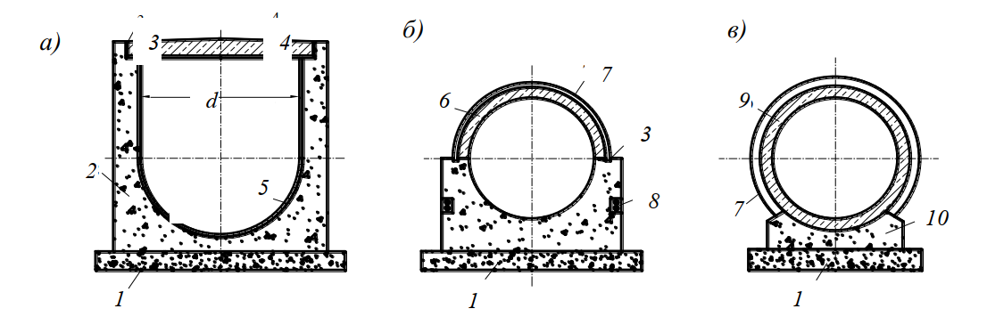 Рисунок 1 – Коллекторы, выполненные при открытом способе строительства: а – полукруглой формы; б – круглой формы (комбинированный); в – круглой формы из труб; 1 – подготовка; 2 – бетонное основание; 3 – битум; 4 – железобетонная плита; 5 – штукатурка; 6 – свод; 7 – бетонный пояс заделки стыков; 8 – железобетонный пояс крепления блоков оснований; 9 – железобетонная труба; 10 – бетонный стул