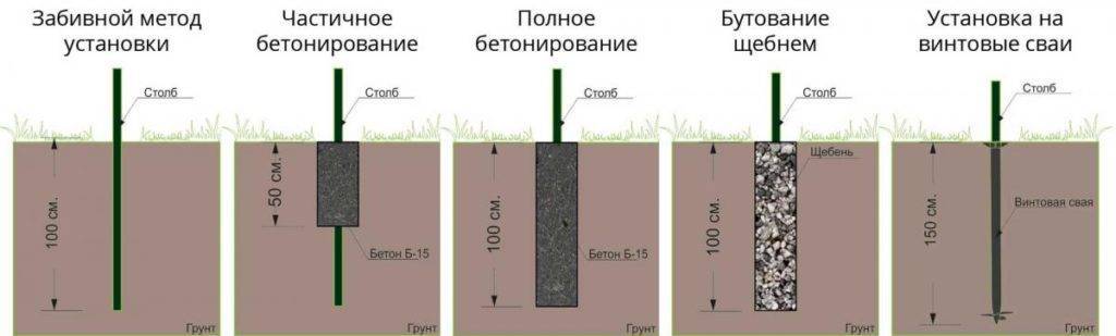 Для столбчатого фундамента достаточно пробурить отверстия в грунте глубиной до 1,5 м. На дне каждой лунки укладывается «подушка» из щебня и песка. Профильная труба должна иметь большое сечение, например, 60х60 мм или 80х80 мм. Причем нижний участок опоры, который будет постоянно контактировать с грунтом, следует покрыть битумной мастикой для защиты от влаги.