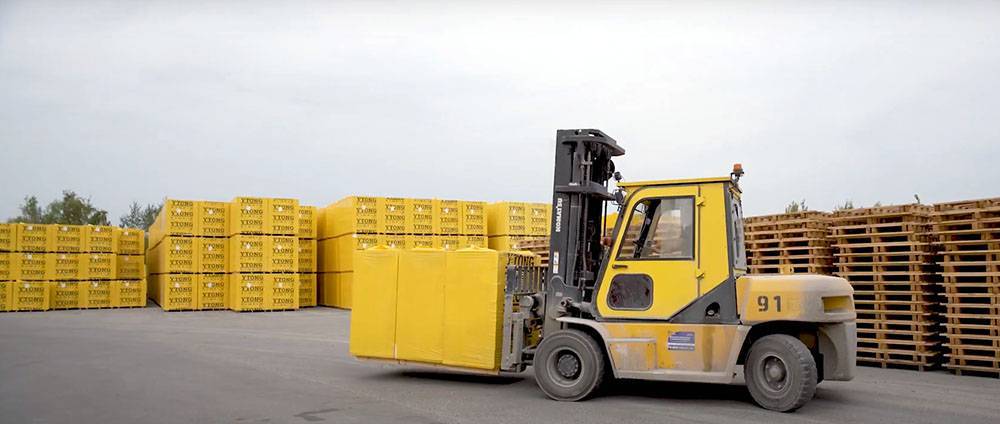 Вилочным автопогрузчиком грузоподъёмностью не менее 1,5 тонны, при условии, что расстояние между его вилками 800-870 мм (то есть соответствует габаритам паллет, которые выходят с завода YTONG). Допустима разгрузка только по одной паллете.