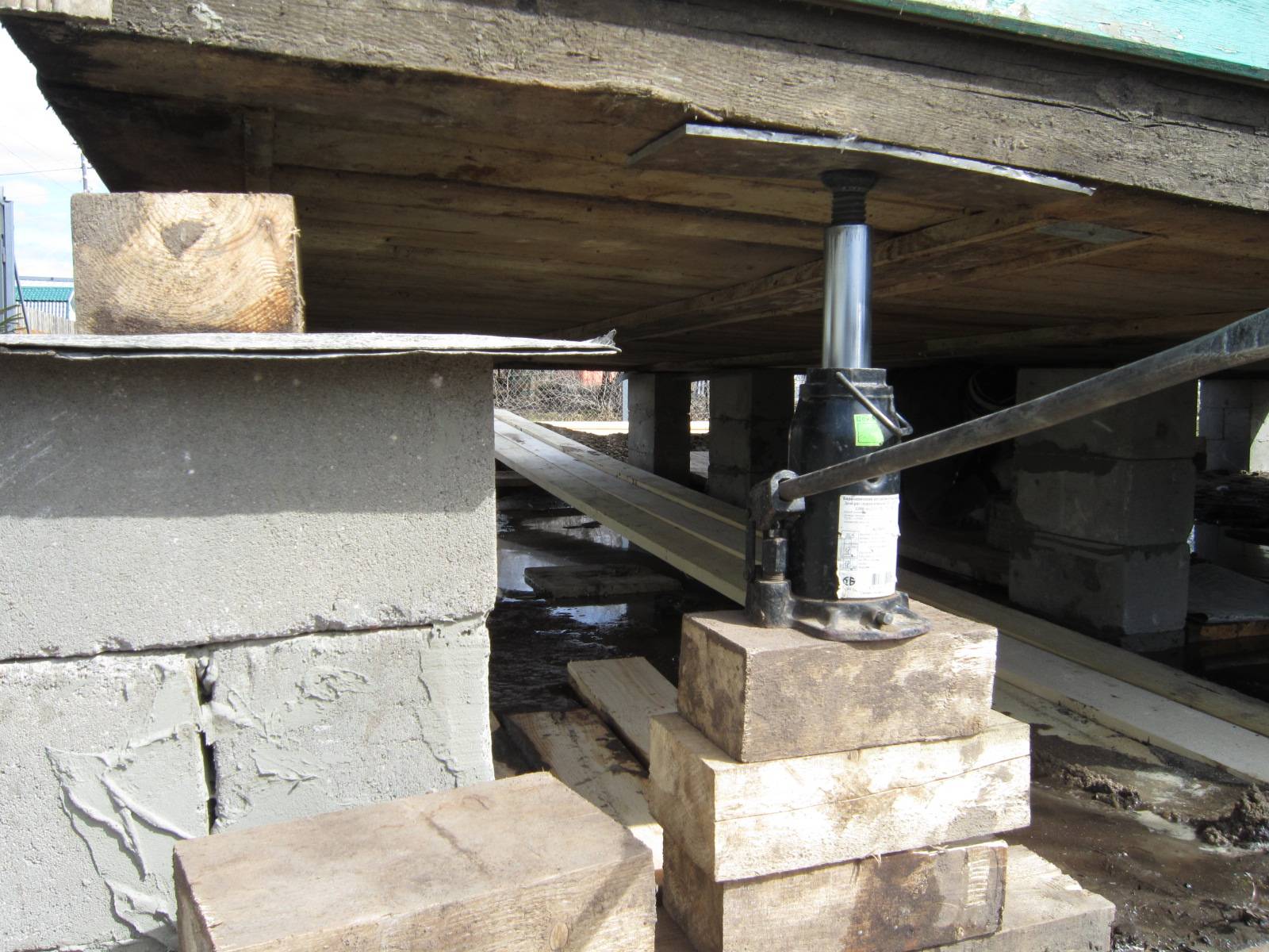 Подъем постройки осуществляется при помощи домкратов, которые устанавливают с обеих сторон здания на расстоянии 0,5 м от его углов. Домкраты фиксируются на специально подготовленной опорной площадке, которую при необходимости заглубляют в грунт для придания ей максимальной устойчивости. Подъем дома осуществляют по возможности одновременно с обеих сторон, равномерно, не более чем на 1,5-2 см за раз. Сразу же фиксируют полученный результат временными опорами.