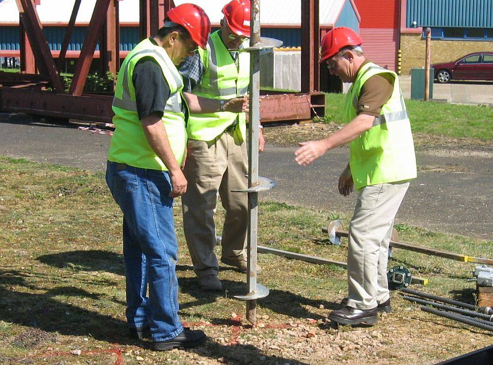 Чтобы самостоятельно определить, какие пласты грунта залегают под строительным участком, проводят пробное бурение. В нескольких местах участка копают скважины, глубиной на 1,5 м больше, чем длина сваи. На лопастях бура остаются частички грунта, присутствующие внутри скважины.