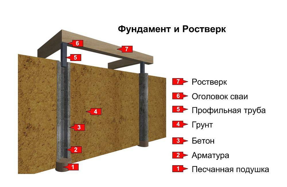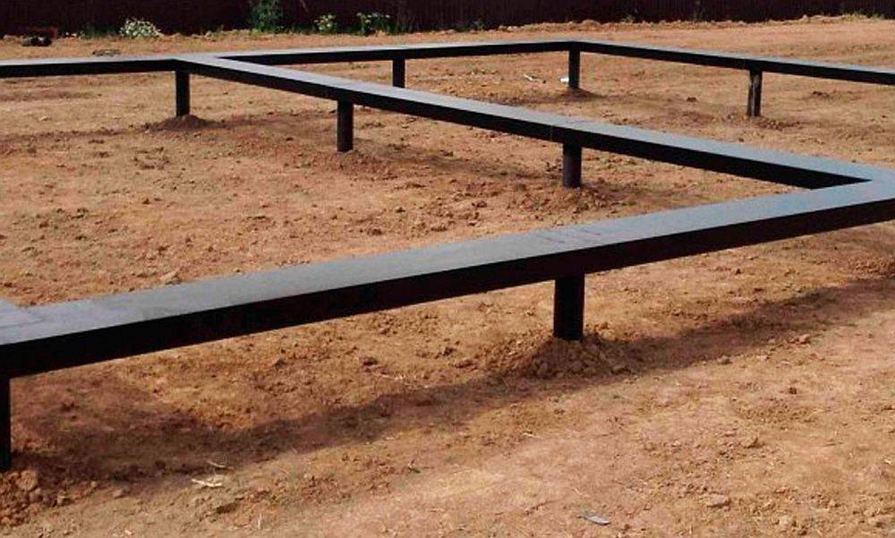 Как правило, ростверк сооружается на высоте 0,5-0,7 м от поверхности земли. Для этого могут применяться деревянные и металлические балки. Также обвязка может быть выполнена путем заливки монолитной железобетонной ленты.