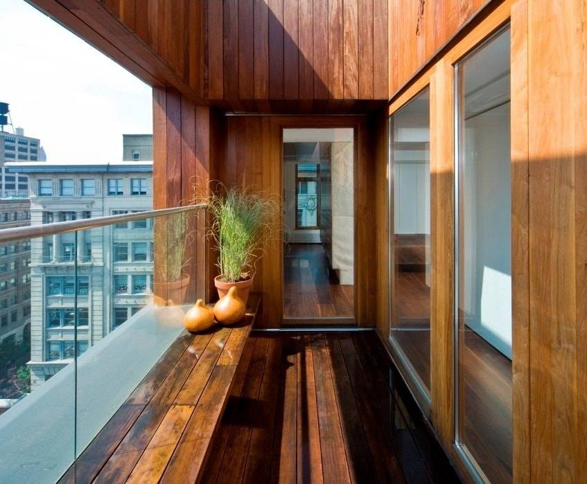 Даже открытый балкон можно преобразовать в стильный уголок отдыха, выполнив отделку всех поверхностей влагостойкими материалами.