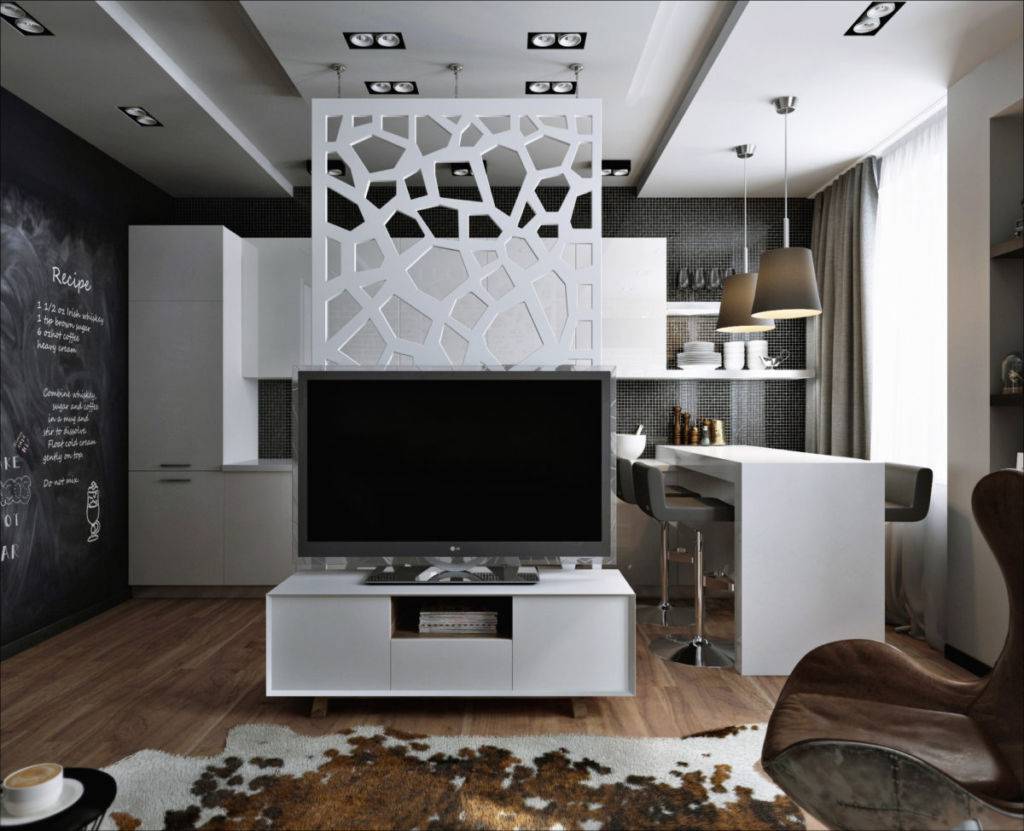 Зонирование кухни и гостиной перегородкой из гипсокартона
